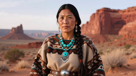 A proud Native American woman stands against a stunning desert landscape, adorned in traditional attire and jewelry. Generative AI.