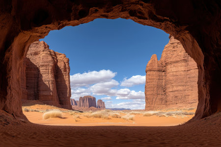 Majestic sandstone formations viewed from a cave opening in a desert landscape
