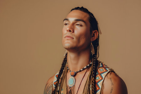 Self-assured Native American gentleman showcasing stylish braided hair and adorned with jewelry against a blue backdrop.