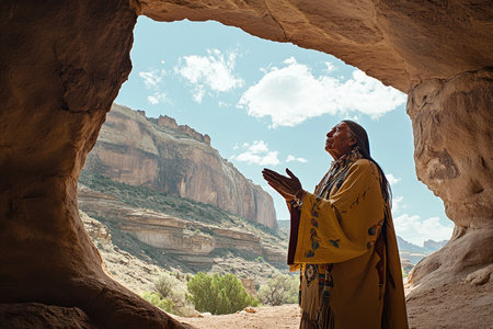 elder performing land blessing in sacred canyon, spiritual connection. Native American heritage