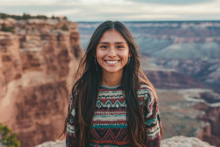 young woman standing on cliff with landscape behind her. Native American heritage day
