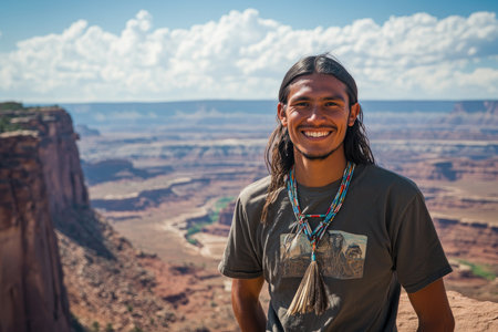 smiling happy young man standing on cliff with landscape behind him. Native American heritage day