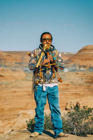 Arizona, USA- September 30, 2021 Native American flute player performing, Glen Canyon sunrise, Arizona