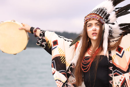 Beautiful shaman woman in native American Indian headdress with face painting, jewelry and tambourine performing ritual near river outdoors