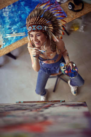 Bird-eye view of a young sexy and attractive female artist with a war bonnet who is in a good mood while sitting in front of the easel and enjoying painting and listening to the music in a pleasant atmospher in the studio. Art, painting, studio