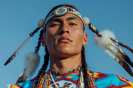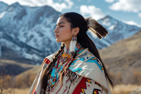 Close up of a young Native American woman showcasing traditional beaded attire and feather adornment, celebrating cultural heritage