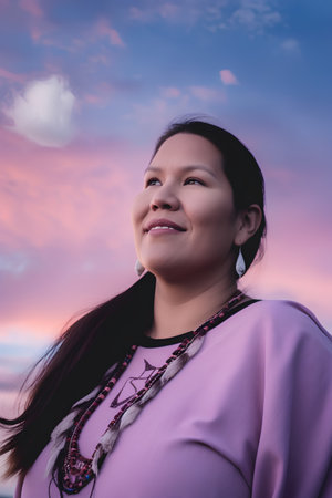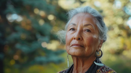 The picture of the american indigenous female standing inside the nature with calm and peaceful, the cultural consultant require skills like the cultural competence and communication skills. AIG43.