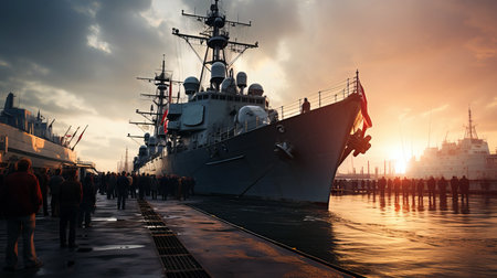 US navy warship stationed in port at sunset.