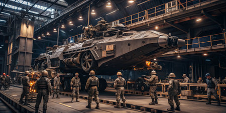 A futuristic military ship at the factory. People and robots in the factory. Future concept.