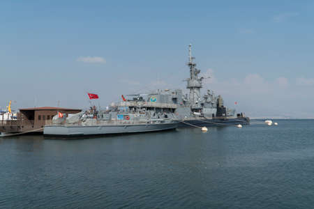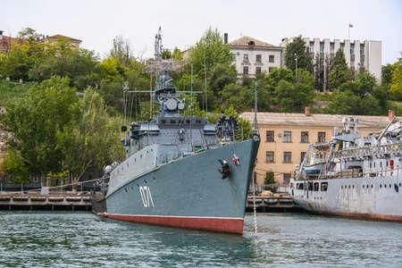 SEVASTOPOL, CRIMEA - AUGUST 24, 2016: Soviet and Russian Black Sea Fleet warships, standing in the quay of the Sevastopol bay, Crimea