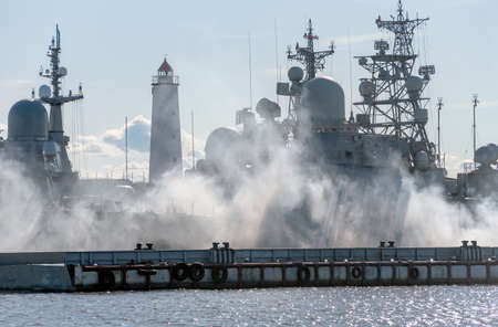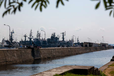 Kronstadt, Saint Petersburg, Russia-August 4, 2021: War ships in the harbor of The Gulf of Finland near the coast of Kronstadt
