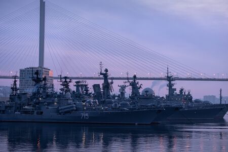 Seascape with silhouettes of warships at sunset. avachinskaya bay, kamchatka