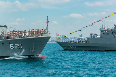 Pattaya, Thailand - November 9, 2017, Navals in activity of fleet review on warship running on sea on the 50th anniversary ASEAN international fleet review 2017 drill in Pattaya, Thailand