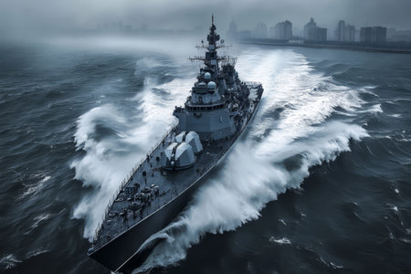 Aerial view of a large battleship at full speed amidst huge waves with city skyline background