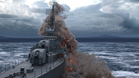 Modern warship launching a missile while navigating through the ocean during a military operation, creating a dramatic trail of smoke and foam in its wake