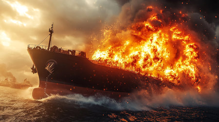 Fire on a cargo ship. A ship carrying liquefied gas caught fire. Explosion and fire on an oil tanker on the high seas. Shelling of an oil or gas tanker. 3D rendering. Illustration. Tankers.