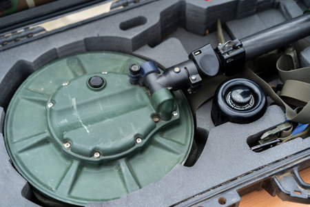 A green cylindrical device lies inside a protective case alongside additional tactical accessories. This setup suggests preparation for military operations requiring precise surveillance.