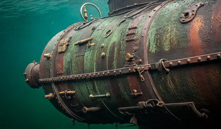 A vintage submersible rests on the ocean floor, its rusted exterior telling tales of underwater adventures. Sunlight filters through, creating an enchanting blue hue around it.