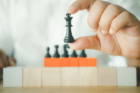 Businessman's hand playing chess game to development analysis new strategy plan, business strategy leader and teamwork concept for win and success.