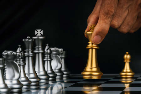 Gold and silver chess with player, Hands of businessman moving chess figure in competition to planning strategy to success play for win.