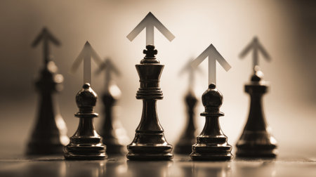 This image captures a chess game with a king piece surrounded by arrows pointing upwards, symbolizing success and strategic planning in personal or business growth.