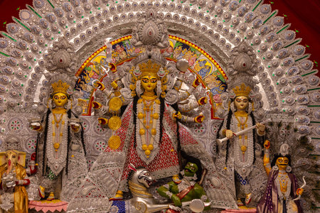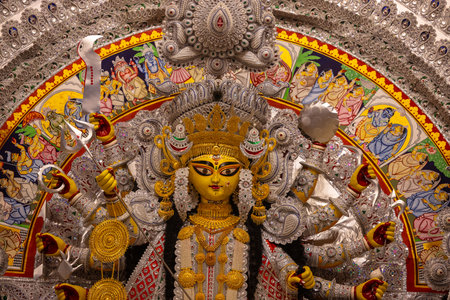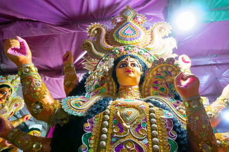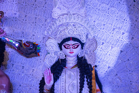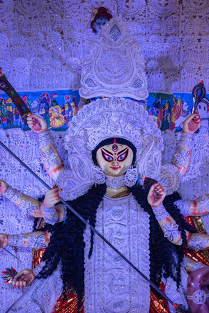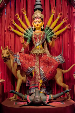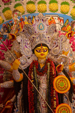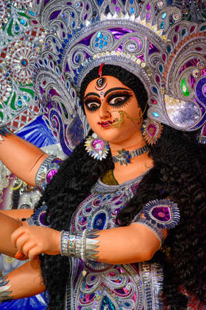 Goddess devi Durga idol decorated at a puja pandal in Kolkata, West Bengal, India. Durga Puja is one of the biggest religious festivals of Hinduism and is now celebrated worldwide.