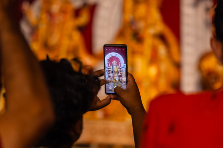 Hand holding mobile phone and taking photos of Goddess Durga idol at a pandal. Durga Puja is the biggest religious festival of hindus of Bengali Community.