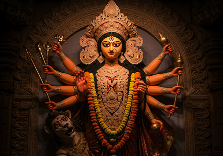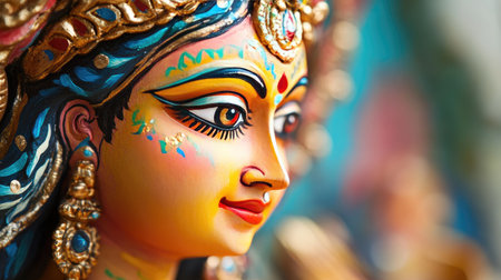 Close-up of a vibrant, intricate clay sculpture of Durga, a prominent Hindu goddess. Generative Ai