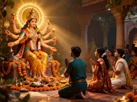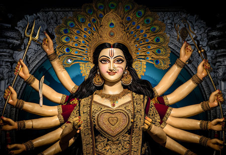 Durga idol in a temple with gold and red decorations, AI