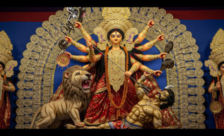 Magnificent idol of Goddess Durga depicted with multiple arms, riding a lion, and triumphing over the demon Mahishasura, adorned in golden details