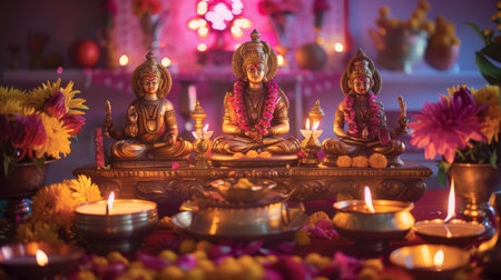 The altar features beautifully crafted deities surrounded by vibrant flowers and flickering candles, creating a warm glow for Navaratri celebrations.