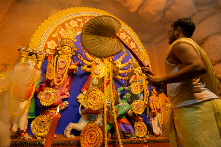 Kolkata, India - October 16, 2018 : Young Hindu Priest worshipping Goddess Durga and airing her idol with a big fan, Durga Puja festival ritual. - shot under colored light. Festival of Hinduism.