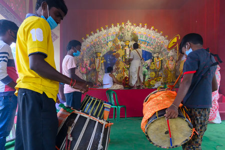 Howrah, West Bengal, India - 25th October 2020 : Dhaakis are playing dhaaks while Goddess Durga is being worshipped by masked Hindu priest with holy pradip during sondhipujo aarti with holy smoke.