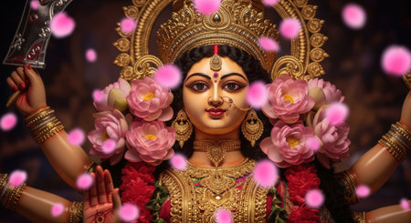 Beautiful statue of Indian goddess Durga surrounded by lotus flowers.