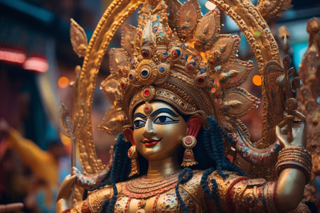 A detailed close-up of a Durga idol, highlighting the intricate gold ornamentation and vibrant colors. Generative Ai