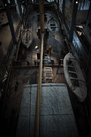 Milan Italy April 2019 - The Ebe training ship exhibited at Museum of technology Leonardo da Vinci - Aerial view of old galleon (Nave Scuola - brigantino - goletta Ebe varato)