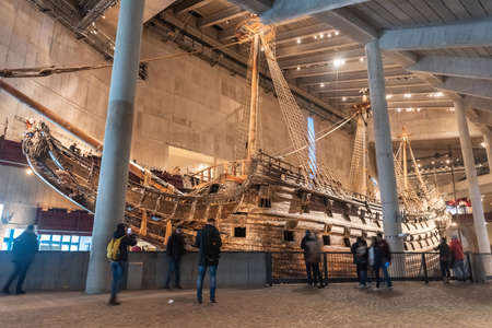 Stockholm, Sweden - November 18, 2018. Interior view of Vasa Museum in Stockholm, with 17th century warship Vasa and people.