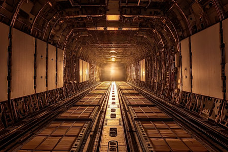 Light streaming through the end of an empty cargo plane tunnel highlights rows of panels and tracks designed for securing cargo, creating a striking industrial atmosphere