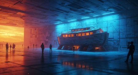 A boat is parked inside of a building. AI generative image.