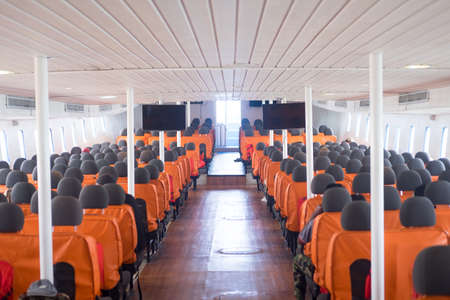 An orange passenger seat in a passenger boat with life vest, Inside of boat
