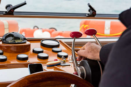 Skipper on deck driving boat steering ship in rough seas with huge waves during storm.