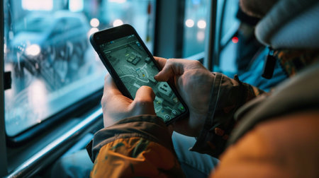 A close-up view of a person navigating using a smartphone map in an urban environment. The image captures technology's role in modern exploration and travel.