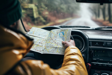 Rear view of a person in a car holding a map, plotting a journey while traveling on a misty, rainstreaked road