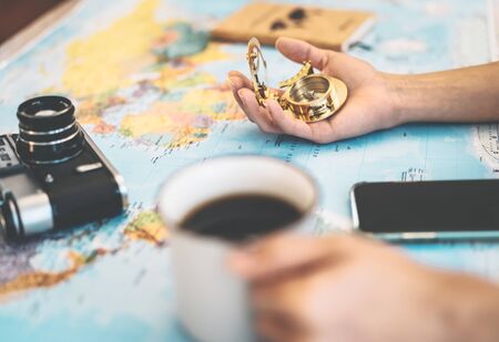 Side view female hands planning vacation with world map and vintage nautical compass - Travel adventure lifestyle people and discovering destinations concept