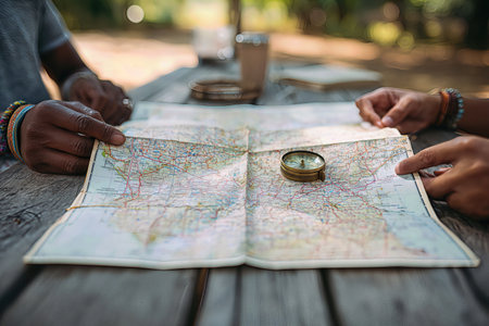 A Close-Up of Hands Examining a Detailed Map and Compass in a Serene Outdoor Setting