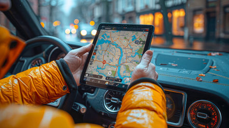Man using mobile phone for gps tracking in car trip, close up of man using everyday technology