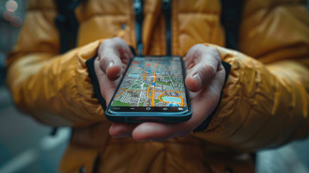 Close-up view of a hiker using smartphones GPS app in mountain travel. In the midst of natures grandeur, the hiker is guided by the GPS app.