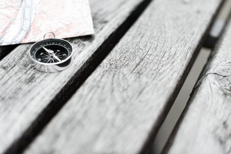 Vintage compass lying on the floor. Adventure and discovery concept.