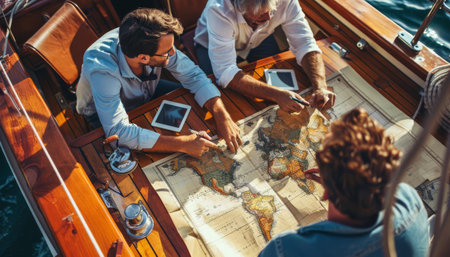 A team of executives on a luxury yacht, charting a course towards success using vintage maps and digital tablets