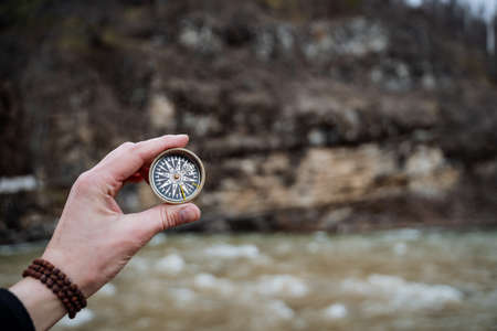 A beautiful male hand with a yellow watch strap holds a magnetic compass in a coniferous autumn forest against a mountain river with rocky stones. The concept of finding yourself the way and the truth